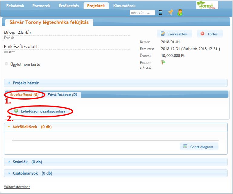 A Rögzít gomb megnyomása után az üzleti lehetőséget és a hozzá tartozó céget hozzárendeltük a projekthez, az eredmény a következő képen látható: